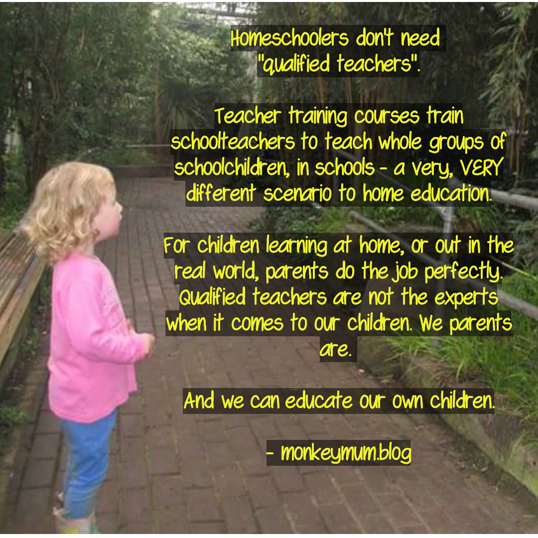 But for children learning at home or out in the real world, parents do the job perfectly. I am both a teacher and a home educator, but I do not use the same skills for both. The skills I use to support my own children’s learning, are the same skills that I’m pretty sure most parents would be able to learn or muster if it came to it. They are skills that are concerned with supporting and allowing our children to learn things as our family chooses. Qualified teachers are not the experts when it comes to our children: we parents are.