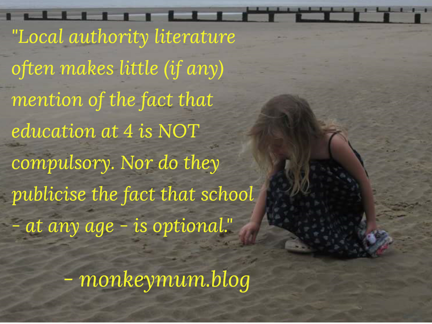 Whatever the reason, the option – the perfectly valid and legal option – to NOT send your 4-year-old to school, is relatively unknown, and rarely talked about. Local authority literature often makes little (if any) mention of the fact that education at 4 is not compulsory. Nor do they publicise the fact that school – at any age – is optional. Instead, they seem, in many cases, to keep this information hidden away in a corner of their website, that you might only find if you type in the right search term.